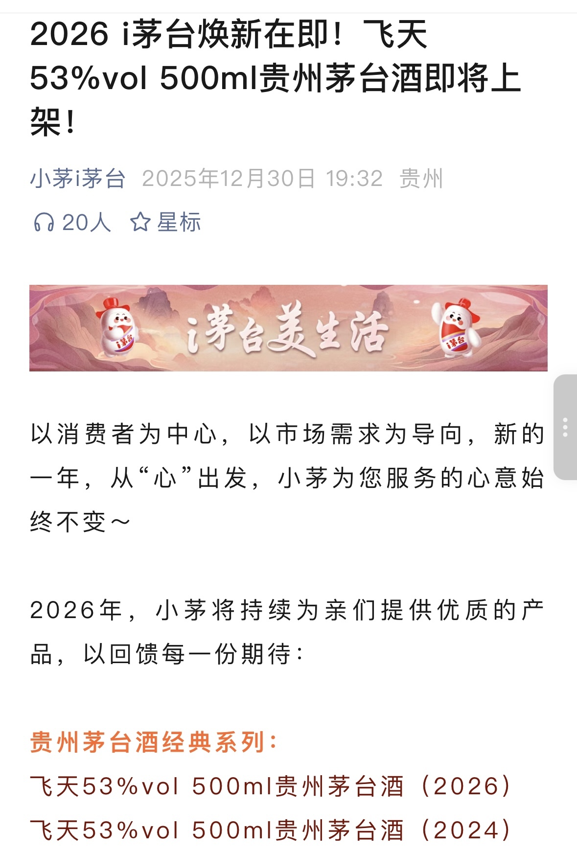 12月30日晚,i茅台官方正式宣布,2026年将调整贵州茅台酒上架产品矩阵,主要有经典、精品、生肖、陈年、文化、低度酒等6大系列,涵盖53%vol 500ml飞天贵州茅台酒等多款茅台酒产品。