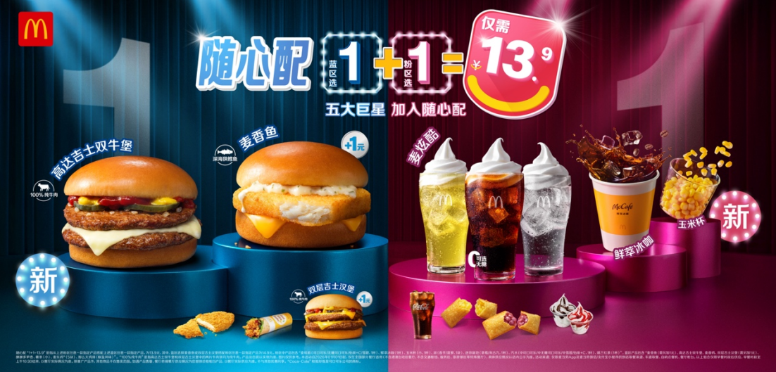 响应粉丝呼声,麦当劳经典的人气产品麦香鱼首次加入随心配1+1选择。升级后的随心配,蓝区涵盖麦香鱼(+1元)、高达吉士双牛堡等多种优质肉类产品选择;粉区加入3款口味的麦炫酷科银宏泰,还新增鲜萃冰咖和玉米杯,轻松实现超百种超值搭配组合。