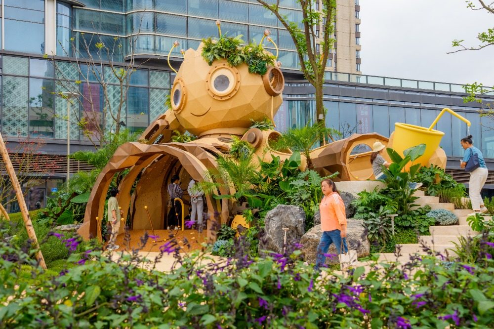 ▲9月26日,渝北区中央公园一商场,小朋友被森林景观所吸引。记者 李雨恒 摄