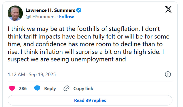 美国前财政部长劳伦斯·萨默斯(Lawrence Summers)上周也表达了类似观点。他表示,“我认为我们可能正处于滞胀的初期阶段”,同时补充称,关税对经济的影响“尚未完全显现”。