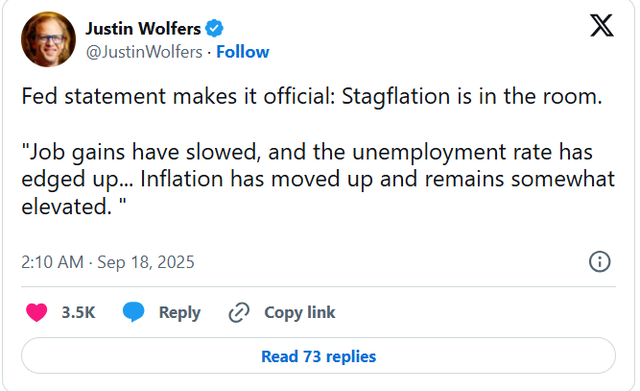 上周,沃尔弗斯称“滞胀已近在眼前”,并援引美联储主席鲍威尔的言论——鲍威尔曾表示,当前失业率持续上升,而通胀仍维持在高位。